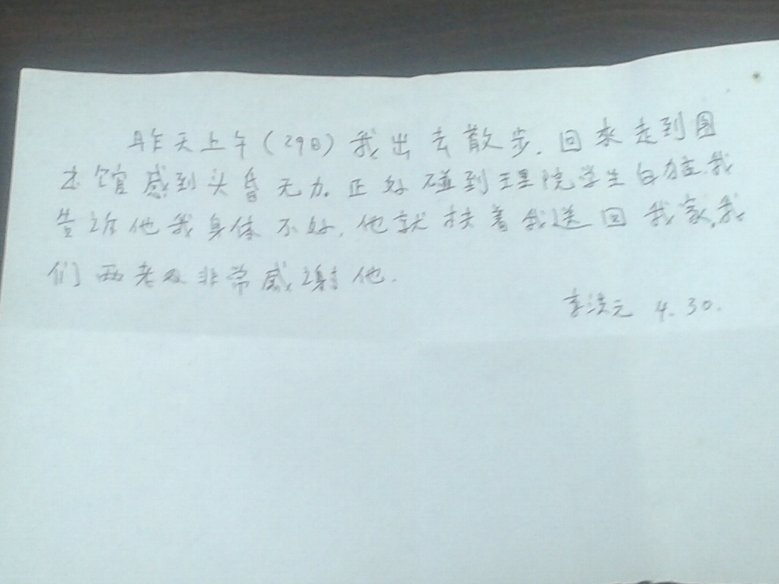 日中午12:30左右白猛猛同学在图书馆前了解到90岁高龄的李洪元老人头晕,随时可能晕倒后,主动将老人送回家。如果没有白猛猛的帮助,后果将不堪设想。为此,30日上午,李洪元老人的爱人亲自将感谢信送到了学院办公室。