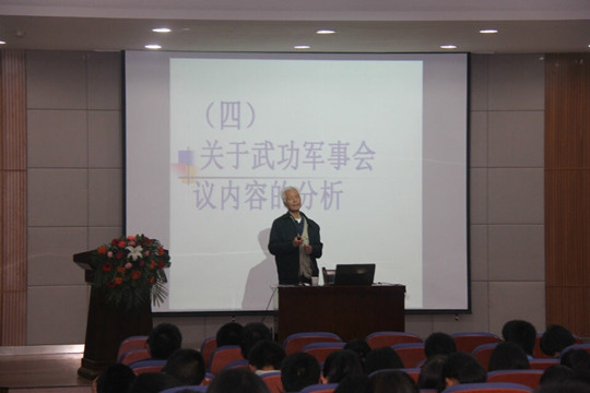 顾毓秀曾说:“武功为后稷圣地,附近有苏武一墓,最近举行的武功会议在抗战史上有重大意义,国立西北农林学院宜将引以为永久无上的光荣。”王教授首先讲述了武功会议召开的背景,由于武功会议当时是秘密召开的,其时间、会议内容都没公布。但这次会议意义重大,不仅鼓舞了北方将士的抗日寇的勇气,更针对中日关系、国共关系、汪精卫叛逃问题作了更明确的决策。在王教授慷慨激昂的讲解下,同学们都专注地听讲,深深地感受到了一份炽热的爱国深情。