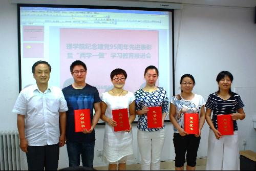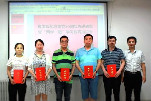 为庆祝中国共产党诞辰95周年,推进“两学一做”学习教育深入开展,进一步弘扬正气、树立典型,激励学院各基层党支部和广大党员坚定信念、对党忠诚、履职尽责、奋发有为,学院于6月29日下午在理科楼E334学术报告厅举办纪念建党95周年先进表彰暨“两学一做”学习教育推进会。会议由党委副书记程晓盈主持,学院党委书记王吉成、副院长王俊儒、党委委员及学院各支部党员代表参加会议。
