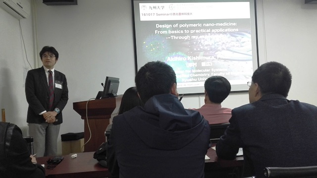 近日,应我院糖生物学科研团队的邀请,日本九州大学Akihiro Kishimura副教授应邀对我校进行访问交流,并为我校师生做题为“Design of Polymeric Nano-Medicine: From Basics to Practical Applications”的学术报告。报告会在理科楼E211报告厅举行,我校师生共50余人到场聆听报告,报告由裴玉新教授主持。