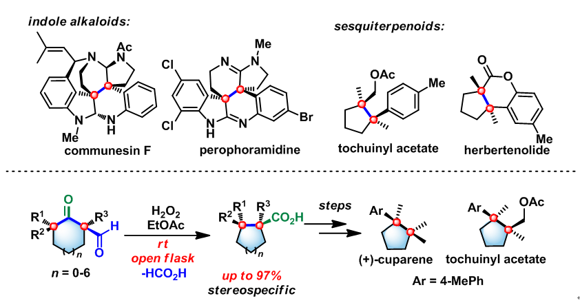 图1.带有连续手性季碳中心的天然产物及双氧水促进的氧化缩环反应