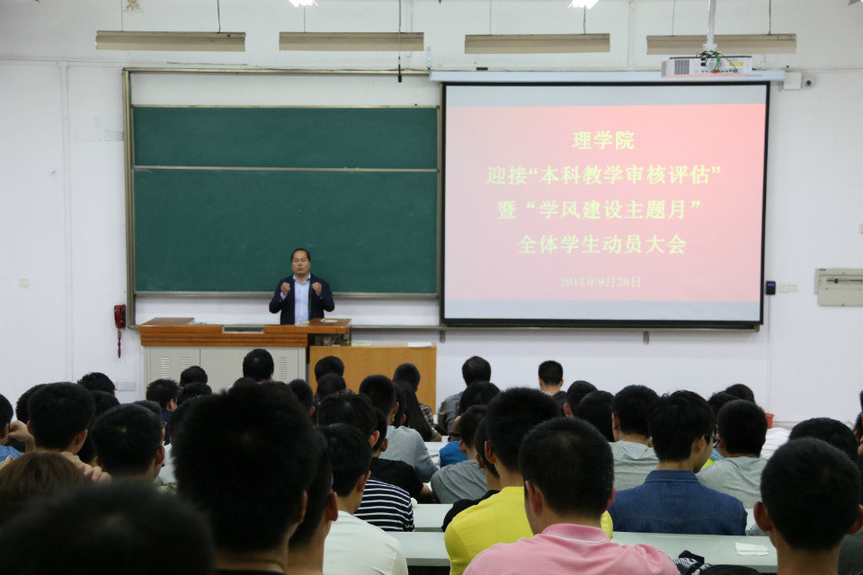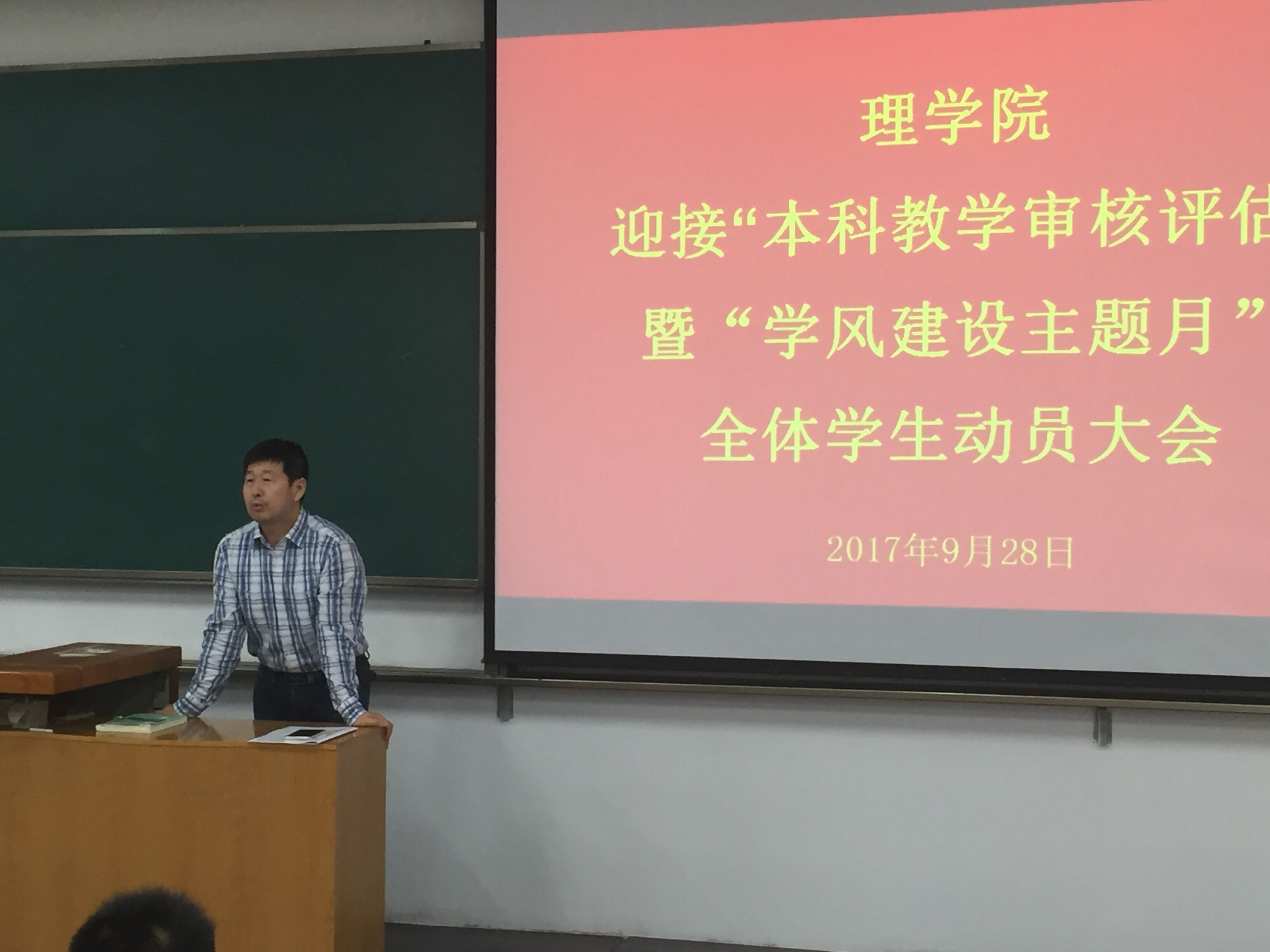 为进一步加强我院学风建设,引导学生树立严格的纪律观念、养成良好的学习习惯,保证本科教学审核评估工作顺利进行,9月28日晚,我院于8T01举行迎接“本科教学审核评估”暨“学风建设主题月”全体学生动员大会。院长张社奇、党委书记王吉成、副院长吴养会、副院长解迎革等学院领导班子成员,以及学院全体本科生参加了此次动员大会。大会由王吉成书记主持。