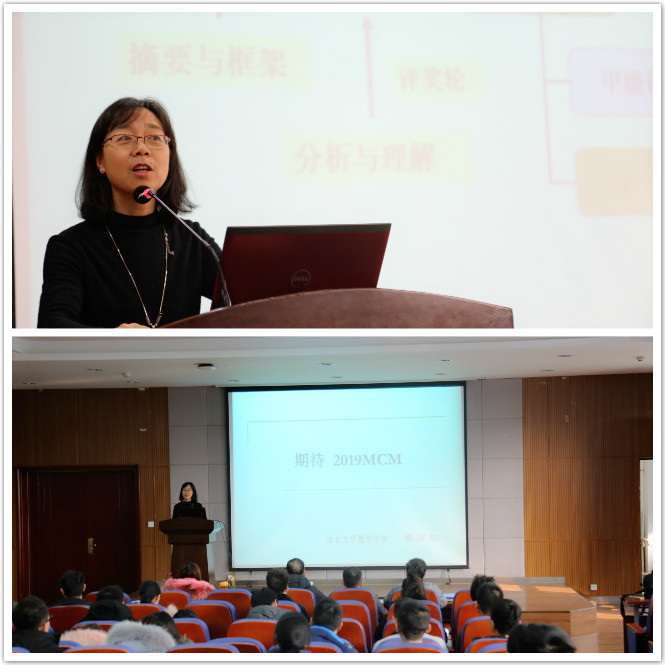 在以“期待2019MCM”为题的报告中,窦霁虹教授主要阐述了美国大学生数学建模竞赛基本内容,论文等级,分析了评委眼中的美国大学生数学建模竞赛、赛题特点。她在报告中指出,在完成数学建模比赛的过程中,赛题的解读非常重要,一个好的建模论文,应能够论证假设的合理性、建模的合理性,能够给出有效解答问题的数学模型,对该模型有稳定性测试、优缺点分析、清晰的结论和清晰的摘要等。一个特等奖的建模论文,应具备结构严谨、条理清晰、简单易懂等特点,它的模型应该是完整且高质量的,模型得到的结论应具有实际意义,并且亮点突出。她同时指出,美国大学生数学建模的赛题具有开放性、包容性和实用性等特点,学生的答卷应具有解法多样、结果多样等特点。数学建模竞赛不仅仅是建模竞赛,也是英语写作竞赛,希望大家平时注重英文论文写作技能的提升,争取写出高质量的建模论文。窦霁虹以数学建模竞赛赛题“指纹是唯一的吗?”为例,深入细致地为师生讲解了拿到题目后如何思考,如何搜索知识,怎么做假设,怎样形成思路,建立模型,逐步完善结果,形成建模论文,体现出一切研究从简单状态做起的科学思维模式。
