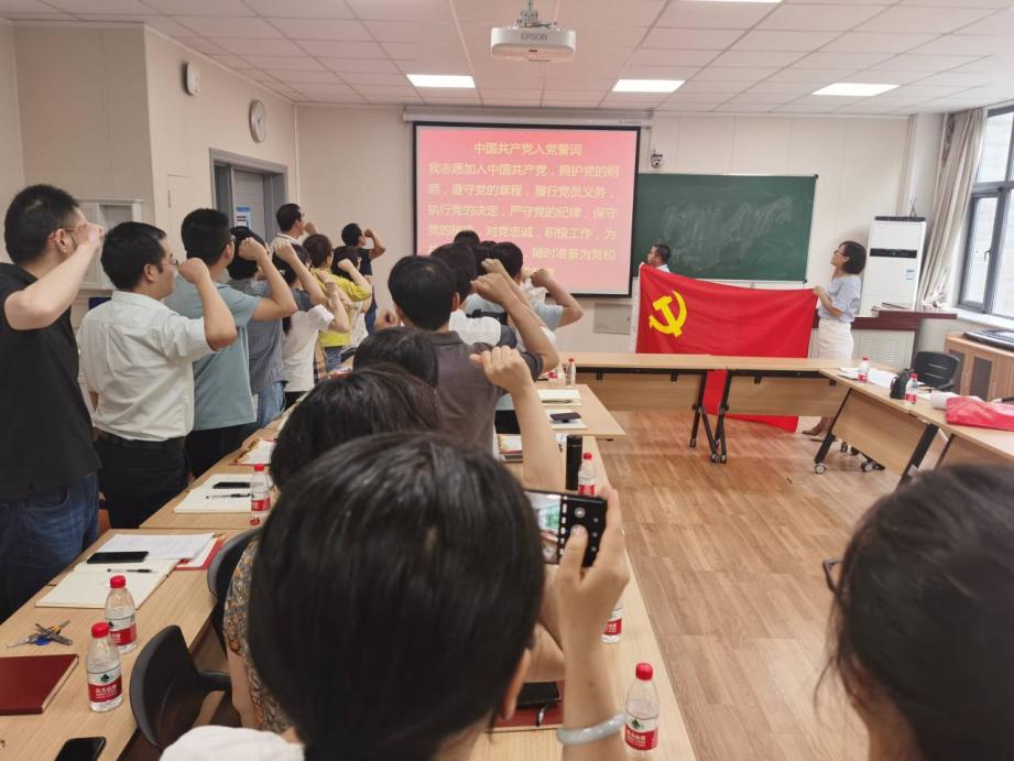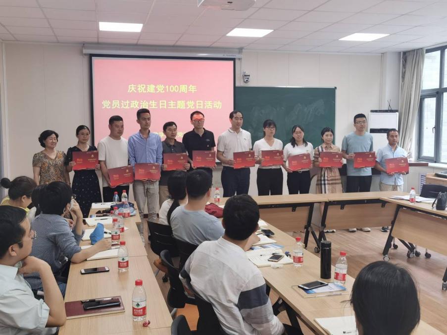 主题党日活动中,刘淑明教授和解迎革教授共同为董立强、谢林林、李涛、柳牧龙等12名党员颁发“政治生日”贺卡,并与党员们重温了入党誓词。