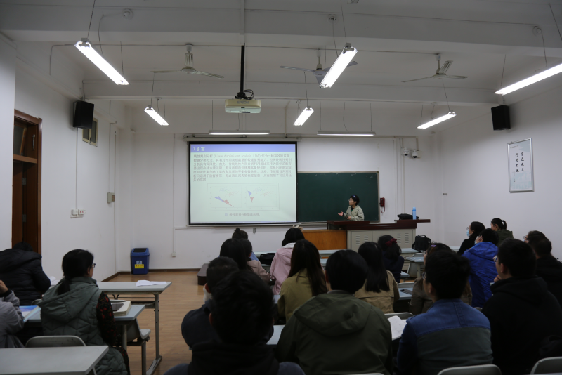 吴彤博士首先介绍了线性判别分析作为一种监督数据分类方法,在数据处理中的优点以及应用范围。接着吴博士分析了传统线性判别分析在数据聚类中的存在的局限性,并且基于此提出自适应线性判别分析来避免传统线性判别分析小样本量问题,并将其进一步推广为半监督和无监督学习问题。其次,吴彤博士详细介绍了所提出的自适应线性判别分析聚类算法的一些具体数学理论推导以及模型求解方法,并展示了数据实验分析结果。最后,吴彤博士与参会教师、研究生进行了交流探讨,回答了大家提出的问题。